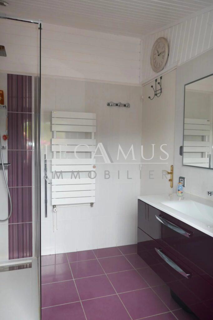 Le rez-de-chaussée comprend aussi 3 chambres sur parquet dont 2 avec placard, un bureau dressing, une salle d’eau moderne et récente, les toilettes et l’espace chaufferie buanderie.